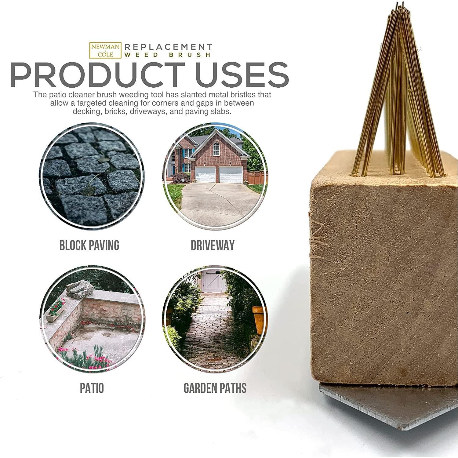 Wooden Weed Brush Heads with Scraper – Pack of 5 This pack contains five replacement brush heads for the Newman and Cole Wooden Weed Brush, designed to make clearing moss and weeds from patios and paving straightforward. Each head features three rows of densely packed wire bristles that effectively remove unwanted growth. A built-in metal scraper assists in tackling stubborn roots and weeds. The bristles are shaped to fit into cracks, scraping out unwanted debris efficiently. These heads can be easily attached to a broom handle for convenient pavement cleaning. For a suitable handle, consider the tapered wooden broom handle (15/16" diameter, 4ft/120cm) with product code 102600.
